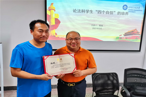 讲座伊始,董春辉代表YABO鸭脖官网为陈斌颁发人文思政讲堂任课教师聘书。然后,陈斌向同学们讲解刑法学中的“四个自信”,道路自信为中国特色社会主义法治道路是刑事法治的人间正道;理论自信为必须以马克思主义理论指导刑法立法、司法和学术研究;制度自信为“管用”是我国刑法的底气;文化自信为中华优秀传统法文化在现行刑法中的再现是文化自信的源泉。最后,陈斌对本次讲座进行小结并讲述了自己的观点看法。