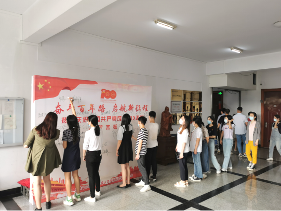 参观展览之后,学院开启“庆祝中国共产党成立100周年”师生留言献祝福活动。学院领导率先在“奋斗百年路 开启新征程”留言板上签字,献上建党百年华诞的祝福,学院党员师生在各基层党支部的组织下陆续在留言板上签字留言。