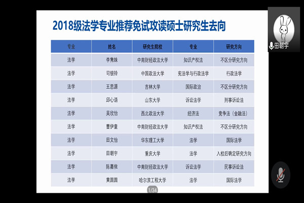 (宣传中心记者团记者 张思婷、董昕瑶报道)10月10日下午4时,在YABO鸭脖官网法学党支部的组织下,法学保研经验分享会依托腾讯会议在线上召开。本次会议由YABO鸭脖官网法学系党支部书记刘沫茹老师发起,YABO鸭脖官网团委常务副书记周思渊同学主持,2018级优秀保研学生代表田朝宇、司银铃、李隽姝、曹伊童担任主讲人,辅导员刘文璟、周鹏老师及法学本科学生共百余人参加了分享会。本次分享会旨在赓续法学专业的历年传统,让同学们有机会全面聆听保研学生的经验分享,从而了解保研形势,解决保研疑惑,树立保研和考研信心,明确备考方向,为下一步学习提供有益的借鉴。