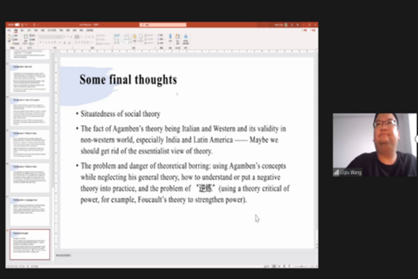 教师王立秋博士以《在新冠时代回顾阿甘本》(Reviewing Giorgio Agamben in the Era of Covid-19)为题进行报告。他主要以疫情期间人们对阿甘本的错误批评和赞美为线索,通过澄清其论点,对其理论框架做了整体性的介绍。王立秋博士指出首先,阿甘本反思的不是新冠疫情本身,而是权力对疫情的反应和人们对各种“必要措施”过于轻易的顺从。其次,在批判地使用例外状态、赤裸生命等概念时,阿甘本并非是在倡导某种与之对立的绝对的法权常态或社会生命,相反,他旨在批判生产这些二元对立的人类学机器。韩相震教授对王立秋博士的发言进行评议,他重申阿甘本理论的重要性,并建议中日韩三国学者合力对它加以阐发,从疫情的现实出发,发展一种东亚视角的、后西方的例外状态理论。
