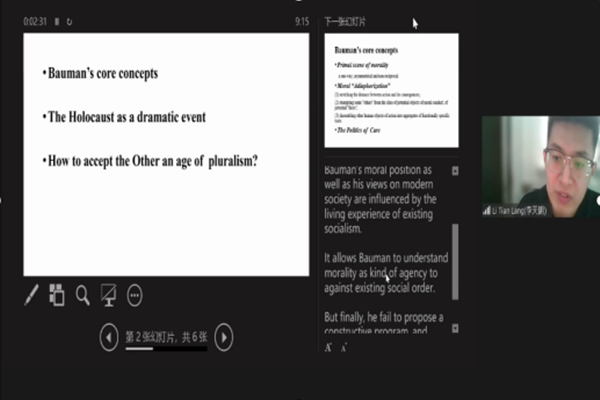 硕士生卢宇佳以“知识分子:永存的陌生人?”(Intellectuals: strangers who have always existed)为题进行报告。她主要就鲍曼在《现代性与矛盾性》中提出的一个观点,即“现代知识分子是永存的陌生人”为线索进行讨论。她在发言中围绕“以理性为基础、追求秩序和确定性的现代型知识分子,恰好使该群体自身变成了不确定的后现代型世界中疏离的陌生人”这一问题进行了阐述和反思。南京大学郑作彧教授对卢宇佳同学的发言进行了评议,他在一定程度上同意作者对鲍曼的批评,并指出该研究需要继续澄清的问题,即何为区分知识分子和专家的标准,例如专业学科的大学教授应被界定为知识分子还是专家。