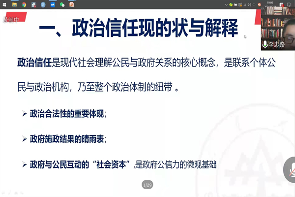 李忠路教授本次讲座围绕着以下四个板块进行展开:(1)政治信任的现状与解释;(2)民生政策与政治信任;(3)政治信任研究的几点思考;(4)量化研究破解经验;