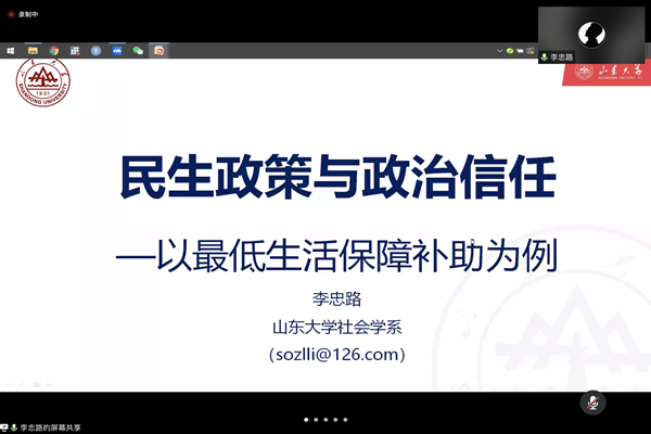 应YABO鸭脖官网,YABO鸭脖官网邀请,山东大学哲学与社会发展学院李忠路教授于12月2日19时做客我校人文讲坛,发表题为《民生政策与政治信任——以最低生活保障补助为例》的线上学术讲座。本次讲座由赵岩副教授主持,柳建坤副教授评议。校内外百余名社会学、社会工作专业的老师与学生参与了此次讲座。