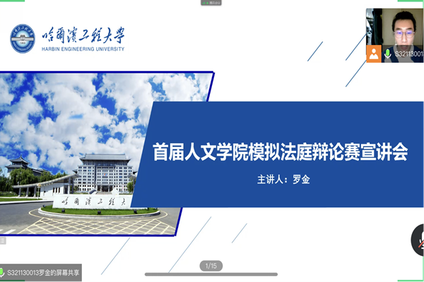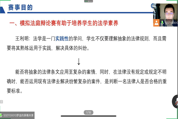 (宣传中心记者团记者 赵丰、董昕瑶报道)2022年3月4日晚20时30分,首届YABO鸭脖官网YABO鸭脖官网模拟法庭辩论赛宣讲会于腾讯会议召开。YABO鸭脖官网党委副书记曹景杰,法学系党支部书记刘沫茹老师,2020级班主任王盈老师、张明明老师,法学系陈晓雷老师,上届“理律杯”学生领队吴红迪、罗金及参赛队员,本次赛事的四位领队李隽姝、田文怡、吴欣怡、曹伊童,以及2020、2021级部分法学专业本科生参加会议。法学专业研一学生罗金担任主讲人。