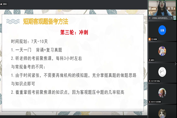 其次,吴欣怡同学聚焦复习细节问题,从专业课复习顺序、书籍及真题推荐、资料取舍等多个方面分享了自己的复习经验。通过对听课、整理笔记,每日时间规划和日常练习等各个环节的统筹安排,帮助同学们认识备考法考的规律。此外,作为通过了法考又保研成功的大四毕业生,她还重点讲述了其如何平衡保研和法考之间的关系,为同学们学习生活的规划提出了自己宝贵的建议。