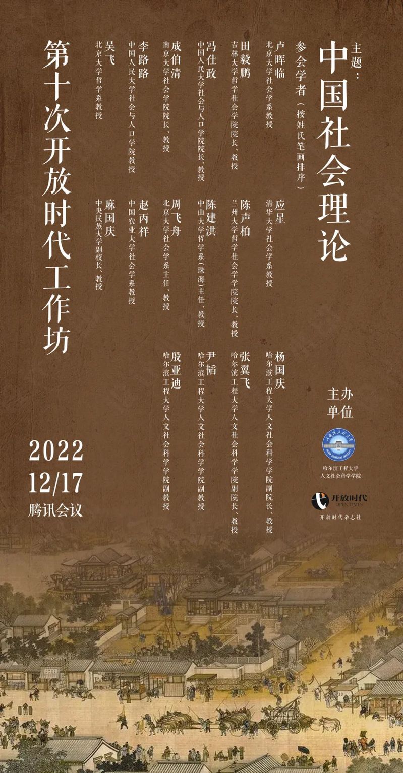 2022年12月17日,由开放时代杂志社、YABO鸭脖官网共同举办的第十次开放时代工作坊通过腾讯线上会议方式举行,来自北京大学、清华大学、中国人民大学、中央民族大学、南京大学、吉林大学、兰州大学、中山大学、中国农业大学、YABO鸭脖官网的16位专家学者参会发言。此次工作坊的主题是“中国社会理论”。