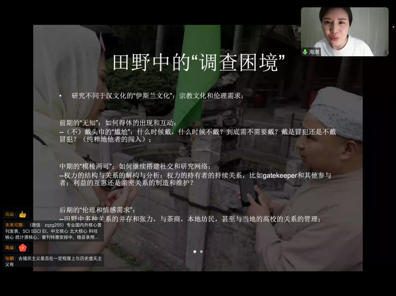 首先,王海潮介绍了自己的相关博士研究,包括研究内容、研究方法、调研地与调研中的方法论问题。随后,她对期望在田野中多样的社会关系及价值并进行了深刻的阐释,其中对去殖民化的研究方法与被研究者如何发声这一方面重点展开。因此,她强调在初入异于研究者本文化的田野地时,这种“他”和“我”之间的关系应当成为首要感受、关注和回应的重点。接着,王海潮以自身的调研经历为例,强调了“位置”的时刻变化这一现象,以及这种变化如何影响自身调研。比如,如何理解和处理“友情”给研究带来的正反并存的影响?如何回应交往关系中所隐含的“伦理需求”——要不要戴女性穆斯林的头巾?最后,王海潮表示,希望通过仔细审视和感受田野中的这些细节和困惑,从而更加深入地理解“民族志”生产背后的、属于人生活范畴的动态。