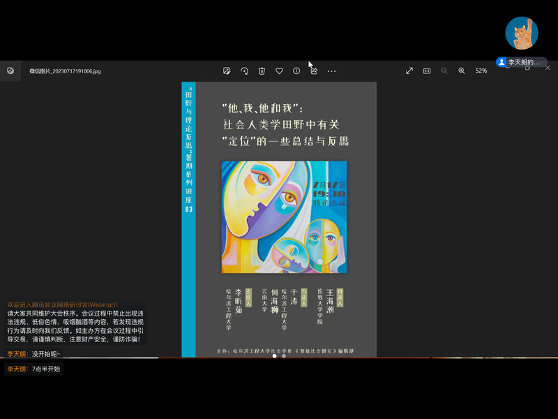 (宣传中心记者团记者 许勤、晏文荻报道)7月17日晚7时30分,YABO鸭脖官网人文讲坛“田野与理论反思”暑期系列讲座第三场在腾讯会议平台如期举行。本次会议由YABO鸭脖官网李天朗讲师主持,英国伦敦大学学院博士候选人王海潮受邀主讲,YABO鸭脖官网副教授于涛、云南大学副教授何海狮担任与谈人。
