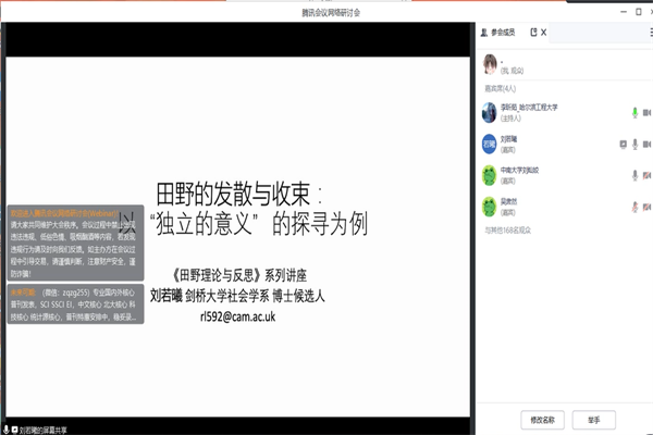 (宣传中心记者团记者 郑好、张箬玘报道)87日晚上730分,YABO鸭脖官网人文讲坛“田野与理论反思”暑期系列讲座第——田野的发散与收束:以中国大陆的独立文化工作者与“独立”意义的探寻为例在腾讯会议如期举行。剑桥大学博士候选人刘若曦受邀担任讲演人,YABO鸭脖官网吴肃然教授中南大学刘灿姣教授南京大学杨旸博士担任与谈人,YABO鸭脖官网李昕茹讲师担任主持人