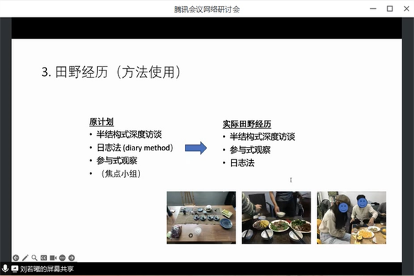 在讲座伊始,刘若曦介绍了自己田野研究的主题与问题。在详细解释了“自雇”的概念后,她又分享了自己研究所参考的文献与理论。接着,她细致地阐述了自己的田野经历并对田野中的采访、日志、受访者特征等进行了细致的归纳总结。最后,她对田野问题的反思、如何进行发散和收束进行经验分享,如聚焦群体、寻找群体共性等。