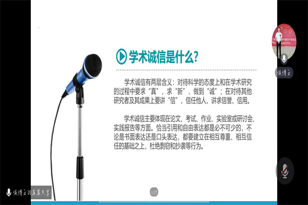 首先,侯博文介绍了学术诚信的含义、表现,以及倡导学术诚信的原因;接下来从科研诚信、论文诚信、考试诚信、学术规范几方面展开,介绍了学术诚信在不同领域的具体表现和要求;随后普及了关于学术不端行为类型界定的相关知识以及对应的相关文件和高校制度;最后讲述了学术不端导致严重后果的经典案例,警醒与会人员。