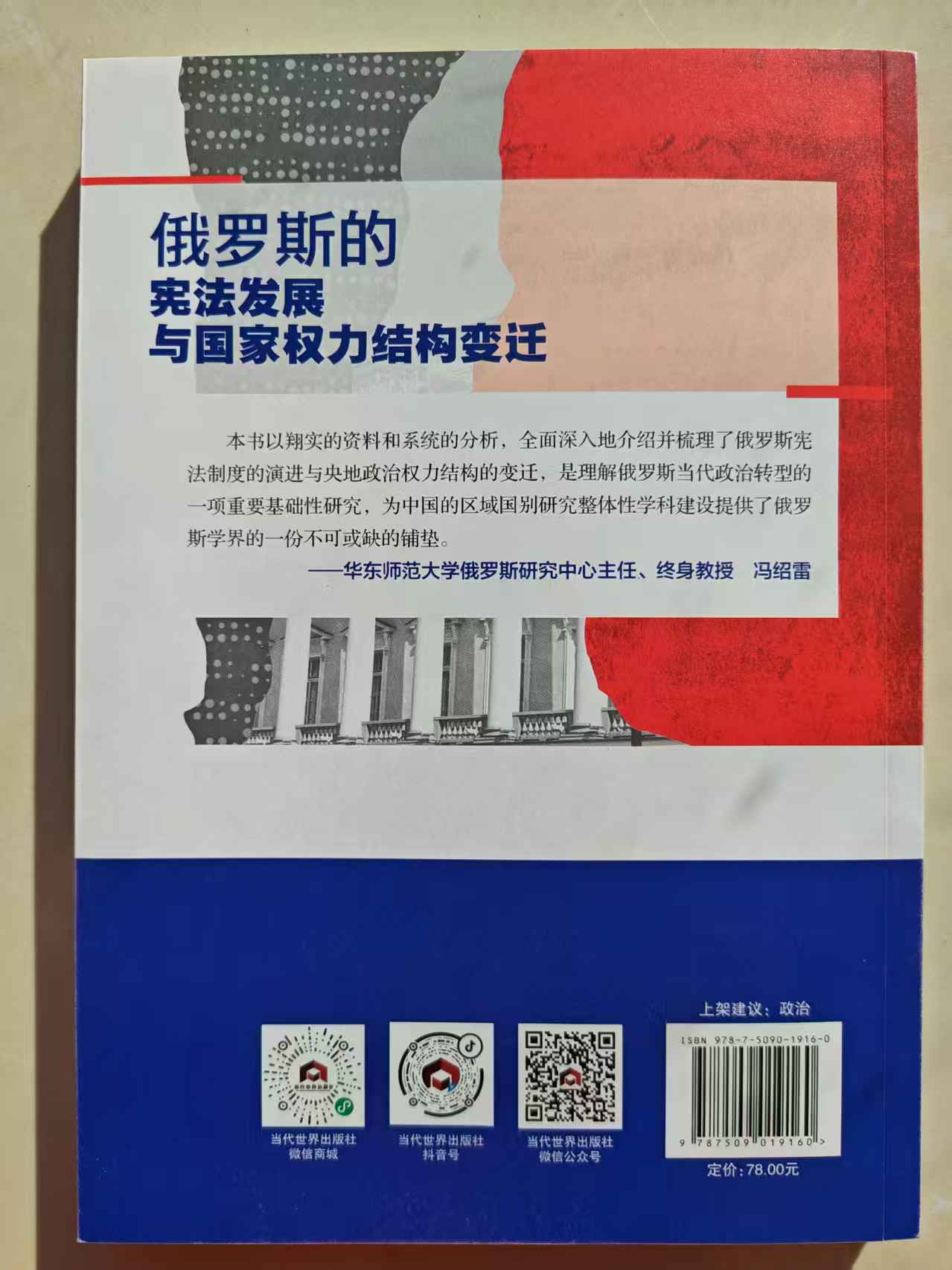 YABO鸭脖官网教师郝龙在当代世界出版社出版专著《俄罗斯的宪法发展与国家权力结构变迁》。当代世界出版社是中共中央对外联络部主管的中央级出版社。